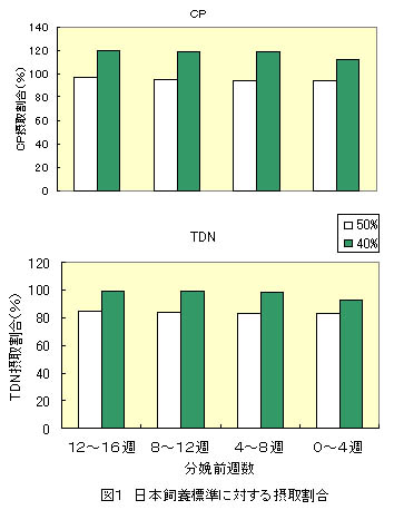 分娩前16週間の平均TDN摂取量は40%区は日本飼養標準の妊娠期要求量の約95%、50%区は妊娠期要求量の約85%であり、CP(粗蛋白質)摂取量は40%区は妊娠期要求量の約115%、50%区は妊娠期要求量の約95%である(図1)。