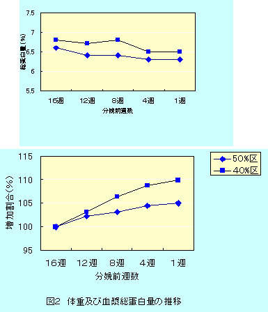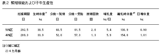 妊娠期の体重増加量は40%区は51.5kg、50%区は22.0kgであり、子牛生時体重は40%区は33.9kg、50%区は30.5kgと両区とも正常な値である。(図2、表2)。