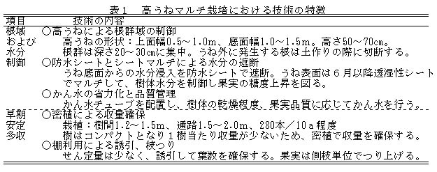 高うねマルチ栽培では、根群域をうね内に制限し、うね底面の防水シートと表面のシートマルチ処理で水の侵入を遮断して、点滴かん水によってかん水の省力化と品質管理ができる。また、密植による垣根状の栽植で収量を高め、棚施設利用による誘引、枝つりで葉数、収量を確保できるシステムである(表1)。