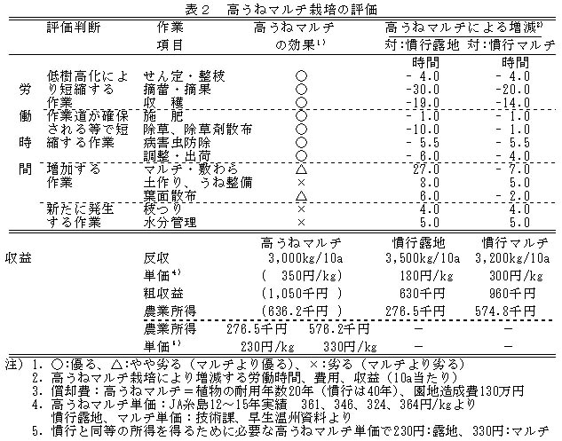 労働面では、高うねマルチ栽培による低樹高化、作業道確保等で摘果、収穫等の作業時間が短縮できる。一方、枝つり、水分管理等の作業が新たに発生する。10a当たりの労働時間は167.5時間となり、慣行露地栽培より25.5時間(13%)、慣行マルチ栽培より44.5時間(21%)の時間短縮が図られる(表2)。
