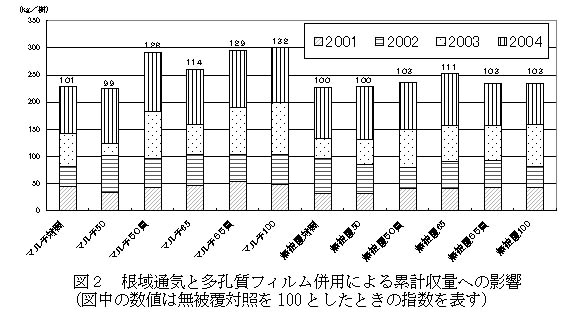 図2 根域通気と多孔質フィルム併用による累計収量への影響