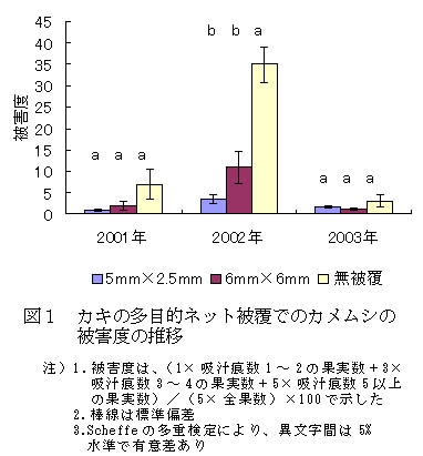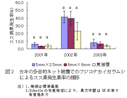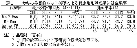 研究課題名:カキの多目的ネット被覆による減農薬・省力安定生産技術の確立 予算区分 :県単 研究期間 :2000〜2003年度