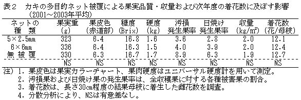 表2 カキの多目的ネット被覆による果実品質・収量および次年度の着花数に及ぼす影響(2001〜2003年平均)