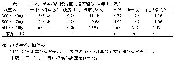 表1 「王秋」果実の品質調査(場内植栽14年生1樹)
