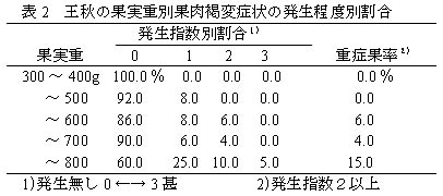 表2 王秋の果実重別果肉褐変症状の発生程度別割合