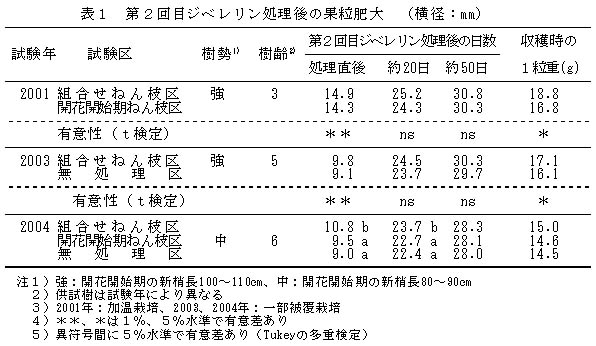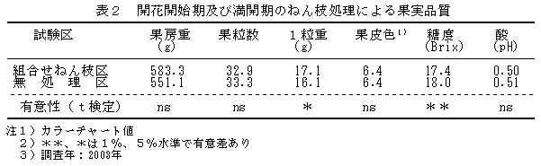 表2 開花開始期及び満開期のねん枝処理による果実品質