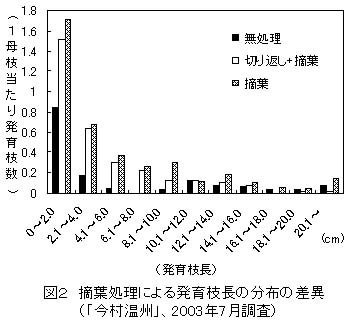 図2 摘葉処理による発育枝長の分布の差異(「今村温州」、2003年7月調査)