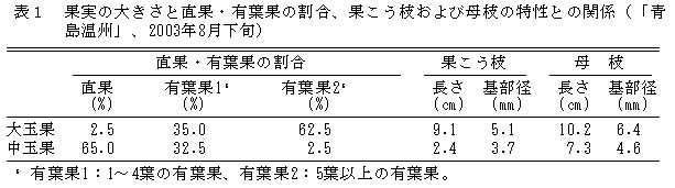 表1 果実の大きさと直果・有葉果の割合、果こう枝および母枝の特性との関係(「青島温州」、2003年8月下旬)