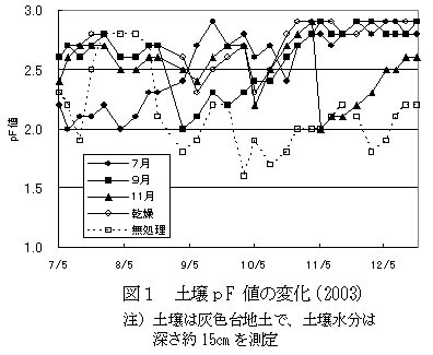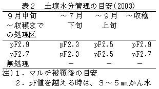 5月中旬から7月までpF2.3、8月から9月上旬まではpF2.5、9月以降pF2.7を各々越えた場合には3〜5mm程度をかん水する。