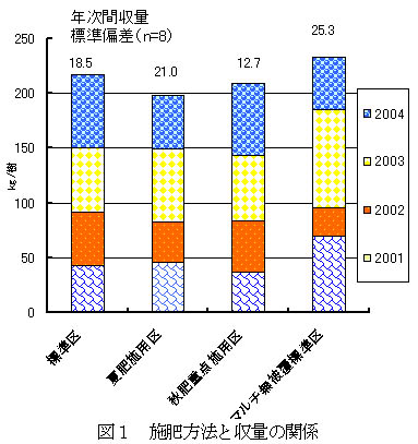4ヶ年の累計収量は、マルチ無被覆標準区(累計収量指数107)、標準区(100)、秋肥重点施用区(97)、夏肥施用区(92)の順であり、秋肥重点施用区では、収量の年次変動が小さい(図1)。