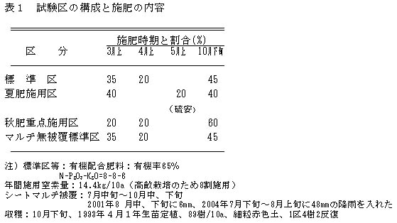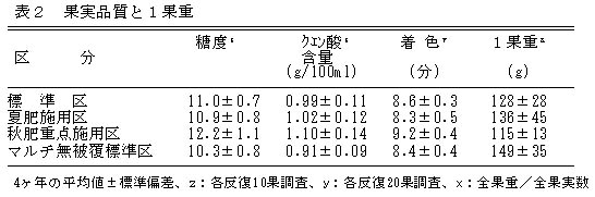 果実の1果重は、秋肥重点区の平均の階級がM、Lと適度の大きさで、果実の1果重の年次変動が小さく、無被覆標準区の平均の階級が2Lとやや大きすぎる(表2)。
