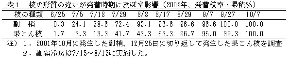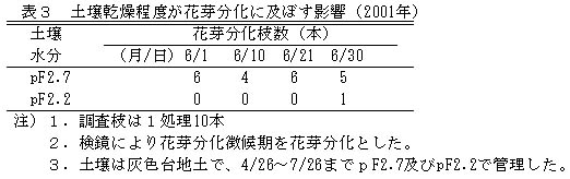 表3 土壌乾燥程度が花芽分化に及ぼす影響(2001年)