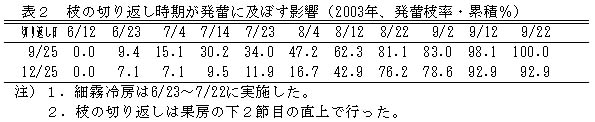 表2 枝の切り返し時期が発蕾に及ぼす影響(2003年、発蕾枝率・累積%)