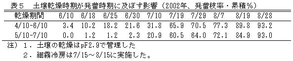 表5 土壌乾燥時期が発蕾時期に及ぼす影響(2002年、発蕾枝率・累積%)
