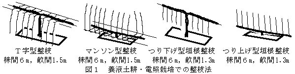 T字型整枝とつり下げ型垣根整枝は、単収が2.4〜2.5tと多く、結果位置はハウス地表面からの高さ51〜100cmが中心となり、作業性が良い(表1、表2、図1)。