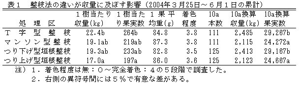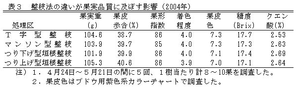 表3 整枝法の違いが果実品質に及ぼす影響(2004年)