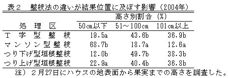 表2 整枝法の違いが結果位置に及ぼす影響(2004年)