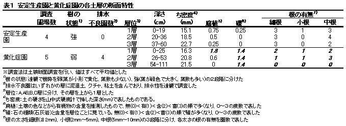 黄化症園では排水不良園が多い傾向で、いずれの土層にも石灰岩礫が存在し、下層にいくほど根が少なくなる傾向である(表1)。