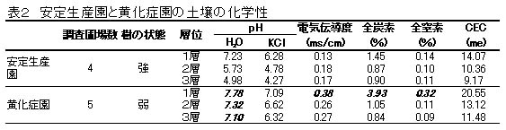 土壌pHは安定生産園が下層にいくに従って低いのに対して、黄化症園はいずれの層も7以上と高い(表2)。