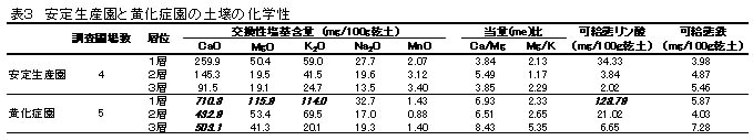交換性カルシウム含量はいずれの層も黄化症園が極めて高く、特に1層目が高い(表3)。