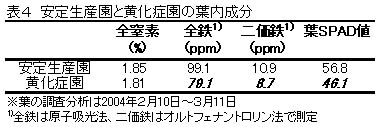 黄化症園の葉内の全鉄、二価鉄、葉のSPAD値は安定生産園に比べて低い傾向である(表4)。