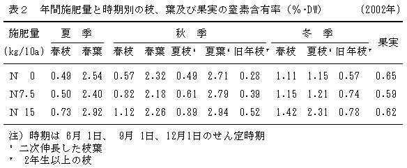 表2 年間施肥量と時期別の枝、葉及び果実の窒素含有率(%・DW)(2002年)