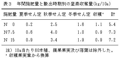 窒素収奪量はせん定量が多い秋季せん定時に最も多く、果実の収穫による収奪量は約1kg/10aで収奪量に占める割合は低い。せん定及び果実収穫による系外窒素搬出量は施肥量が基準量(15kg/10a)及びその1/2量の場合で約7kg/10a、施肥量が0kg/10aでは約5kg/10aである(表2)。