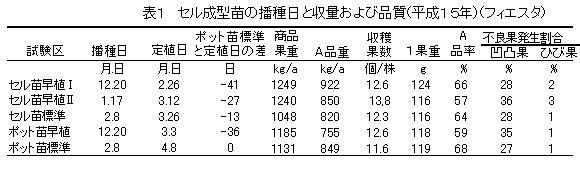 表1 セル成型苗の播種日と収量および品質(平成15年)(フィエスタ)