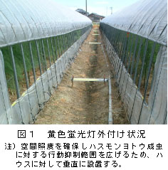 黄色蛍光灯は、ハウス内の天井部に設置するより、ハウスの外周に設置する方がハスモンヨトウのハウス内侵入を抑制する効果が高い(表1、図2)。