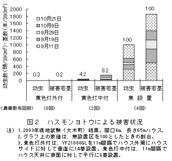 20Wの黄色蛍光灯を11m間隔でハウスの外周を囲むように設置すると、ハスモンヨトウによる若茎の被害を著しく軽減でき、農薬散布を0〜1回(無設置では4〜6回)に低減できる(表1、図1、図2)。なお、黄色蛍光灯は、妻面からのハスモンヨトウ成虫の飛び込みを防ぐため、妻面にハウス2棟につき1基設置する。