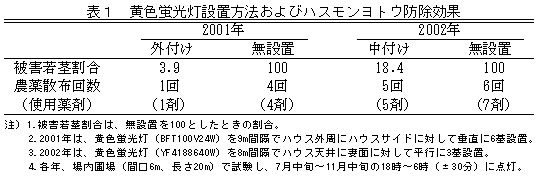 表1 黄色蛍光灯設置方法およびハスモンヨトウ防除効果