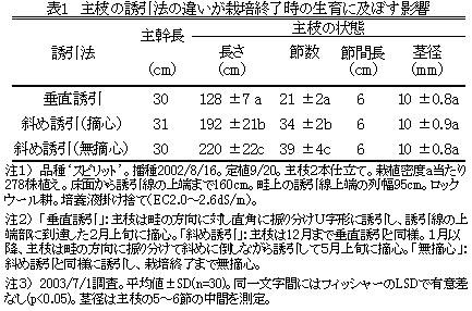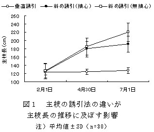 斜め誘引は、垂直誘引に比べて主枝の伸長にばらつきが生じるが、主枝が長く、節数が多くなる(表1、図1)。