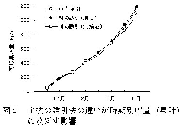 斜め誘引は垂直誘引に比べて5月以降の収量が多くなり約10%増収する(表2、図2)。