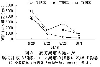 図3 液肥濃度の違いが葉柄汁液の硝酸イオン濃度の推移に及ぼす影響