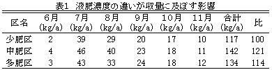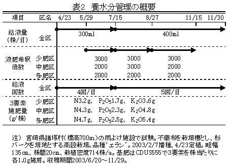 液肥(N成分15%)濃度は、高温期のみ3000倍とし、その前後を2000倍で管理すると生育および収量が優れる(表1、図1、図2)。