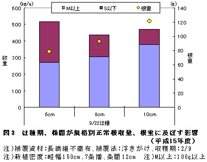 図3 は種期、株間が規格別正常根収量、根重に及ぼす影響(平成15年度)