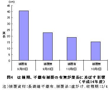 図4 は種期、不織布被覆の有無が葉長に及ぼす影響(平成14年度)