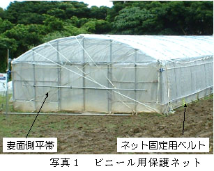 プラスチック製のロープを用い、45cm目合いで構成されるビニール保護ネット(写真1)は常設型であり、強風時にビニールを展張する場合には強く固定する。固定方法:ハウス側面地際部で等間隔に配置された「ネット固定用ベルト」を強く引張する。次に、妻面側は屋根に固定した平帯を交差させて妻面地際にある固定金具に縛る。