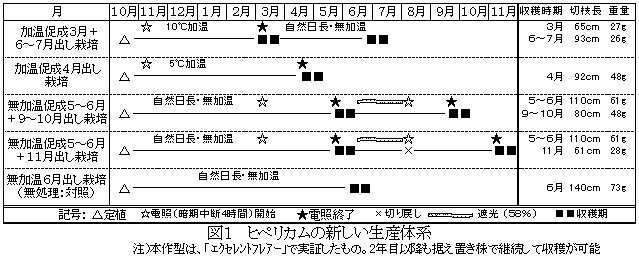 ヒペリカムは、従来にない実付きの切り枝花木として注目され、花束やフラワーアレンジメントの花材として、需要の拡大が期待されている。また、最近では品種数も増加している。しかし、ヒペリカムの切り枝生産は露地季咲き栽培が主体で、出荷時期が6月頃に限られている。生産振興のためには、長期出荷できる生産体系の確立が必要である。