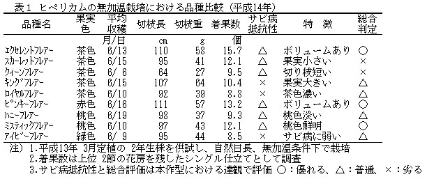 表1 ヒペリカムの無加温栽培における品種比較(平成14年)