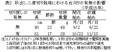 表2 秋出し二度切り栽培における台切りの有無の影響(平成15年)