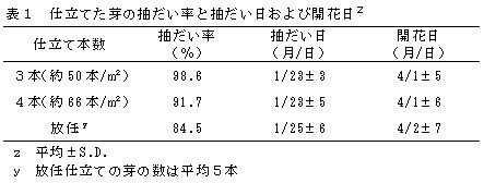 表1 仕立てた芽の抽だい率と抽だい日および開花日z