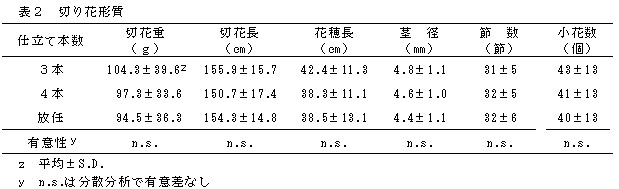切り花形質は仕立て本数3本で最も大きくなるが、仕立て本数の違いで有意な差は得られなかった(表2)。