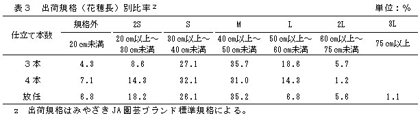 出荷規格別の比率は仕立て本数3本で高規格の比率が高くなる(表3)。