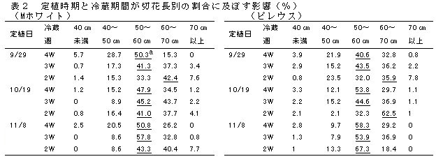 表2 定植時期と冷蔵期間が切花長別の割合に及ぼす影響(%)