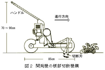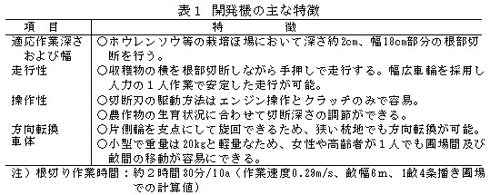 機体に搭載したエンジンの回転運動をクランクを介して地中に埋没した切断刃の前後運動に変え、軟弱野菜の根部を切断するため、抵抗が少ない(図1、図2、表1)。