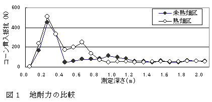 オランダ式二重管ポータブルコーン貫入試験によると干拓地の地耐力は熟畑地、未熟畑地ともに地表下0.2mで最大約0.5KNで以下減少し0.9m以下は約0.1KNで一定となる。熟畑化することにより地表下0.6m程度までは地耐力は増加する。(図1)