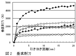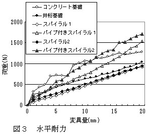 水平耐力ではパイプ付きスパイラルが耐力があり次にコンクリート基礎が高い。井桁基礎、スパイラル基礎は同程度で約1KNの耐力である。(図3)