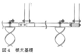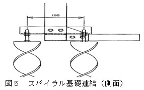 基礎にはスパイラル基礎(長さ1000mm、幅100mm、スパイラルの厚さ9mm)2本を用いそれぞれの基礎同士を金具で連結し、さらに金具同士を高張力鋼角パイプで連結した根太基礎工法である。(図4、図5)