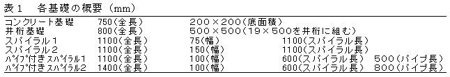 スパイラル杭、コンクリート基礎、井桁基礎による垂直耐力を比較するとスパイラル杭と井桁基礎が2KN以上でコンクリート基礎より高い。また、スパイラル部の幅75mmと150mmを比較すると、約2倍の耐力があり幅の広いスパイラル基礎ほど垂直耐力がある。(表1、図2)